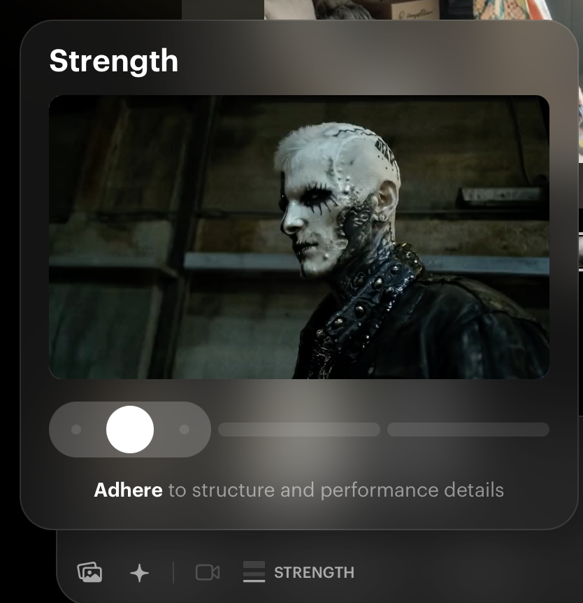 Camera Note: Higher Modify Strength settings can reduce how much camera motion is preserved from your input video. At the highest Reimagine settings, the system may infer camera movement based on the subject's pose, which can create zooms or shifts that reinterpret the original shot.