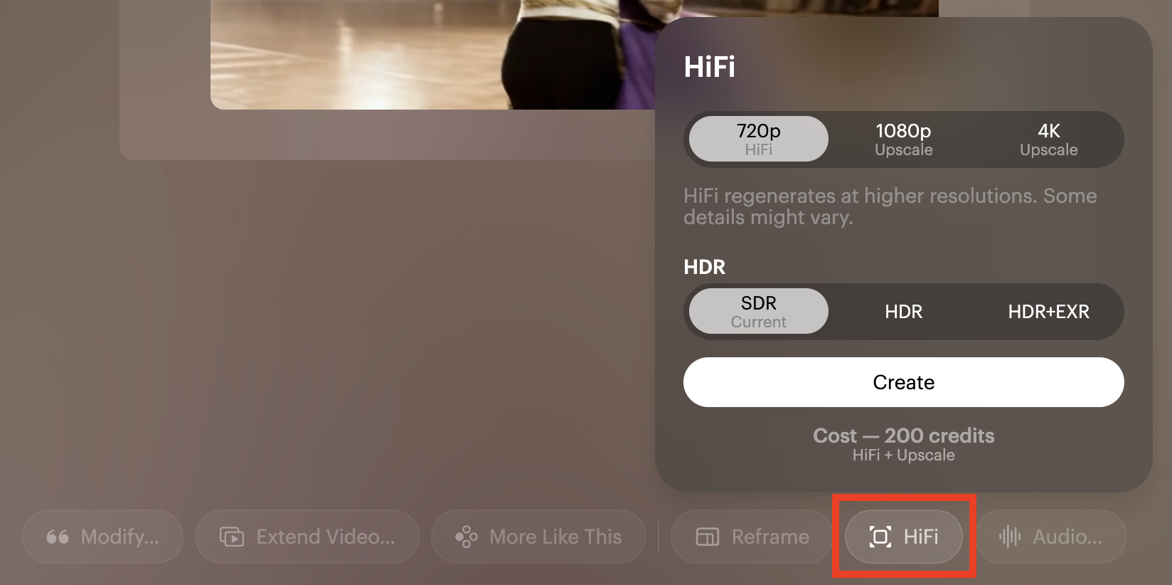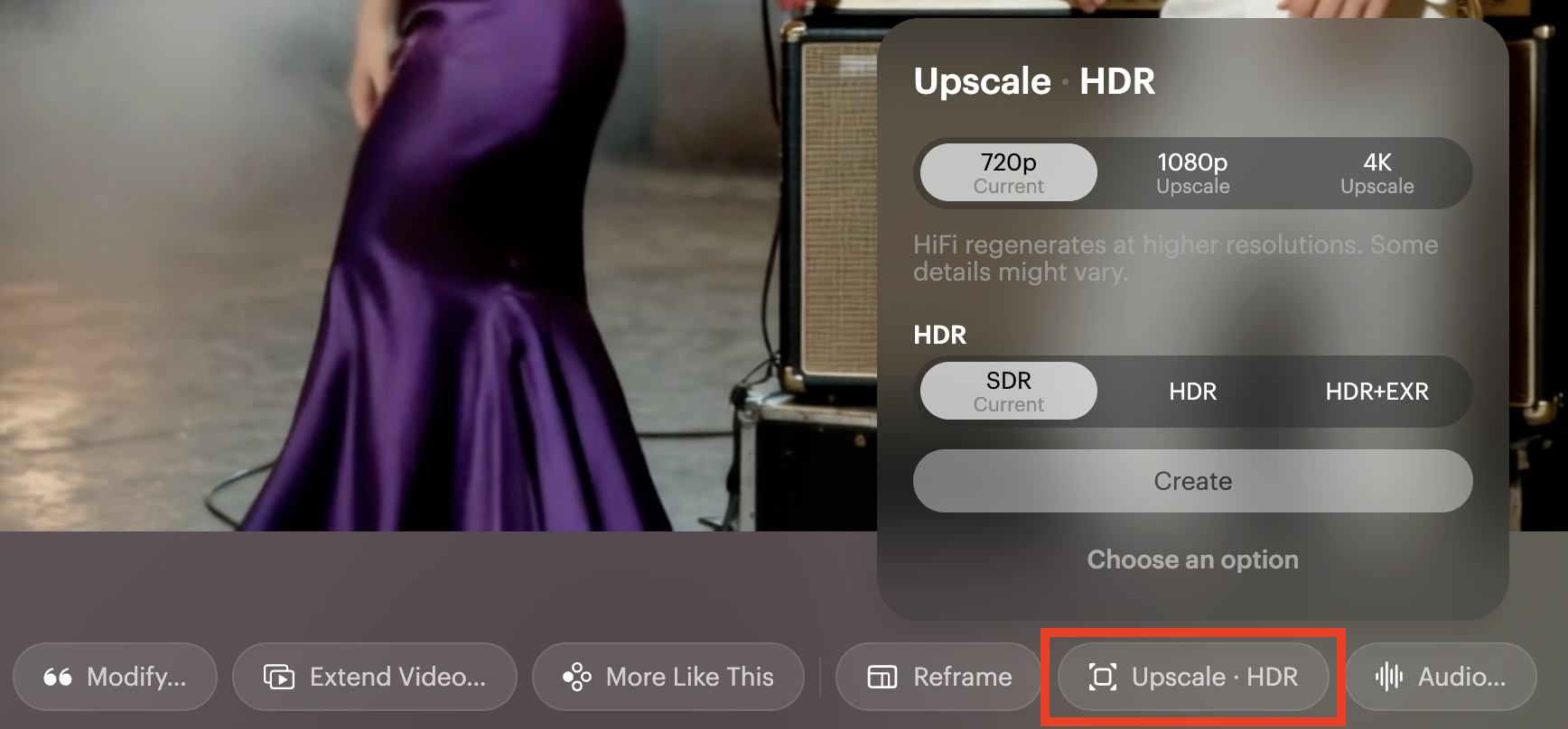 To convert your file to HDR and EXR, click on the generation to expand it. Then, press HiFi (for Draft Mode) or Upscale/HDR (for 720p generations).
