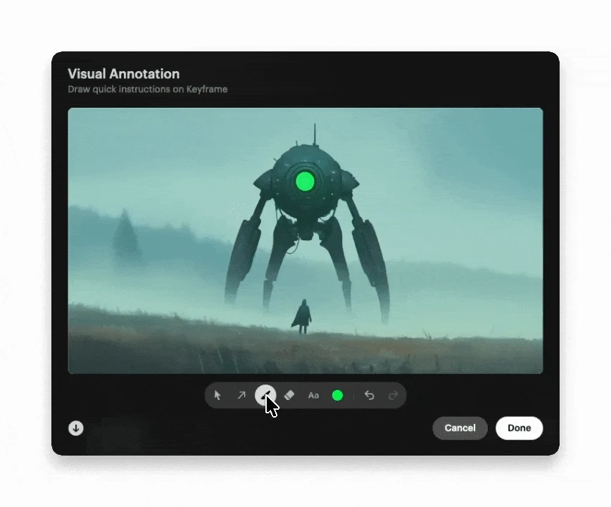 With Dream Machine's Visual Annotation feature you can now add your instructions directly on the image/keyframe that you upload into your composer window, making it visually more intuitive and engaging than writing your instructions into the composer itself, as you're giving your instructions, you're able to engage with it and look at it as you're writing your commands and able to think visually instead of focusing on language.