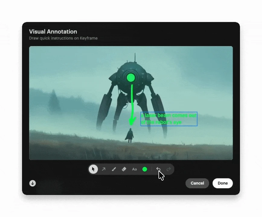 Keep your written commands short and sweet, and place them over or near the visual area where you want that change to happen. Turn on Draft Mode for quicker and cheaper experimentation as you practice. For best results, be direct and descriptive with your Text Box instructions, use natural language and mention all the elements related to your direction, instead of "laser beam" write "a laser beam comes out of the robot's eye".